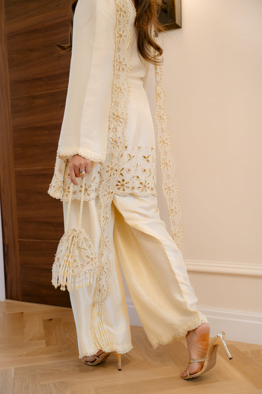 An ode to timeless elegance, this collection celebrates the delicate artistry of cut work, pearls, and beads — perfected over nearly a year of dedicated craftsmanship. From the pale yellow raw silk set with intricate embellishments to the soft pink ensemble exuding feminine charm, and the sage green design defined by pearl details and graceful embroidery — each look radiates effortless sophistication.