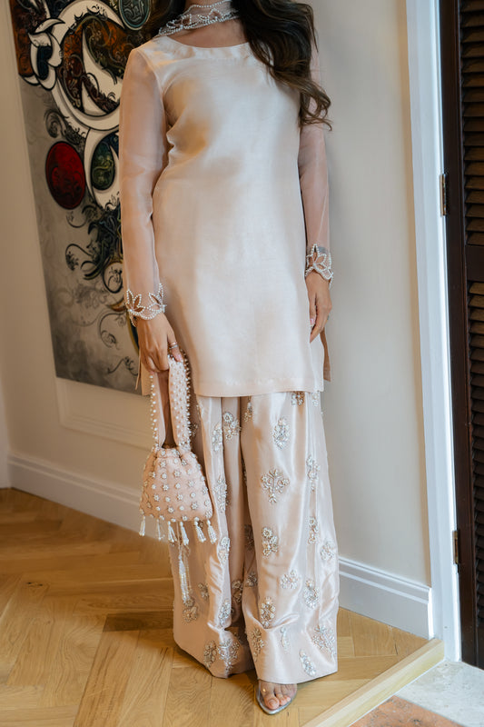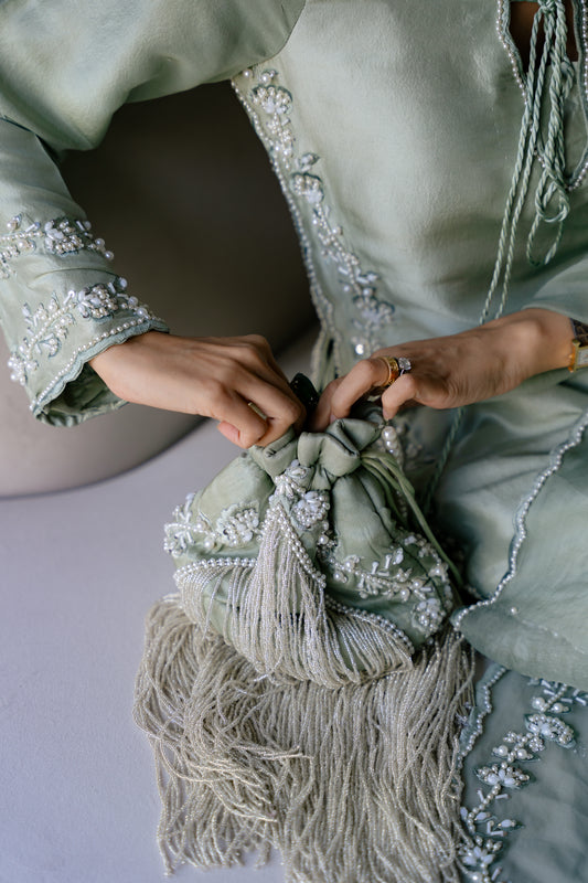 An ode to timeless elegance, this collection celebrates the delicate artistry of cut work, pearls, and beads — perfected over nearly a year of dedicated craftsmanship. From the pale yellow raw silk set with intricate embellishments to the soft pink ensemble exuding feminine charm, and the sage green design defined by pearl details and graceful embroidery — each look radiates effortless sophistication.