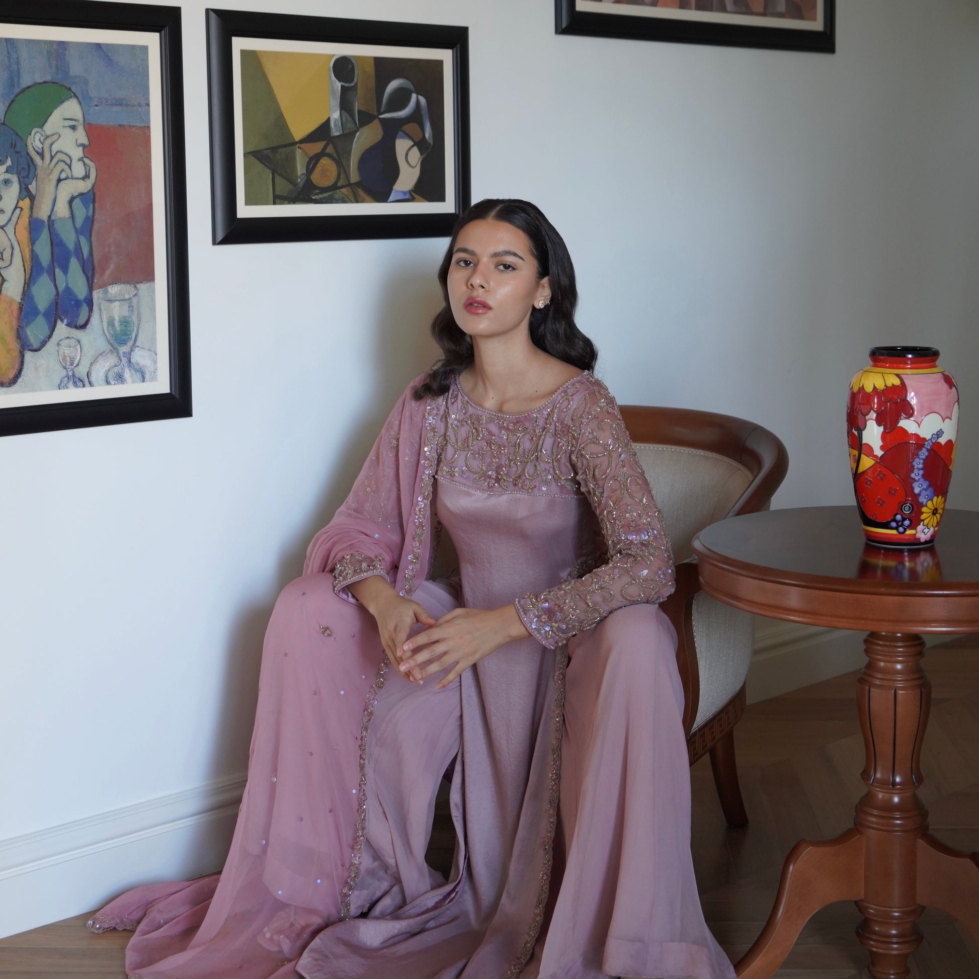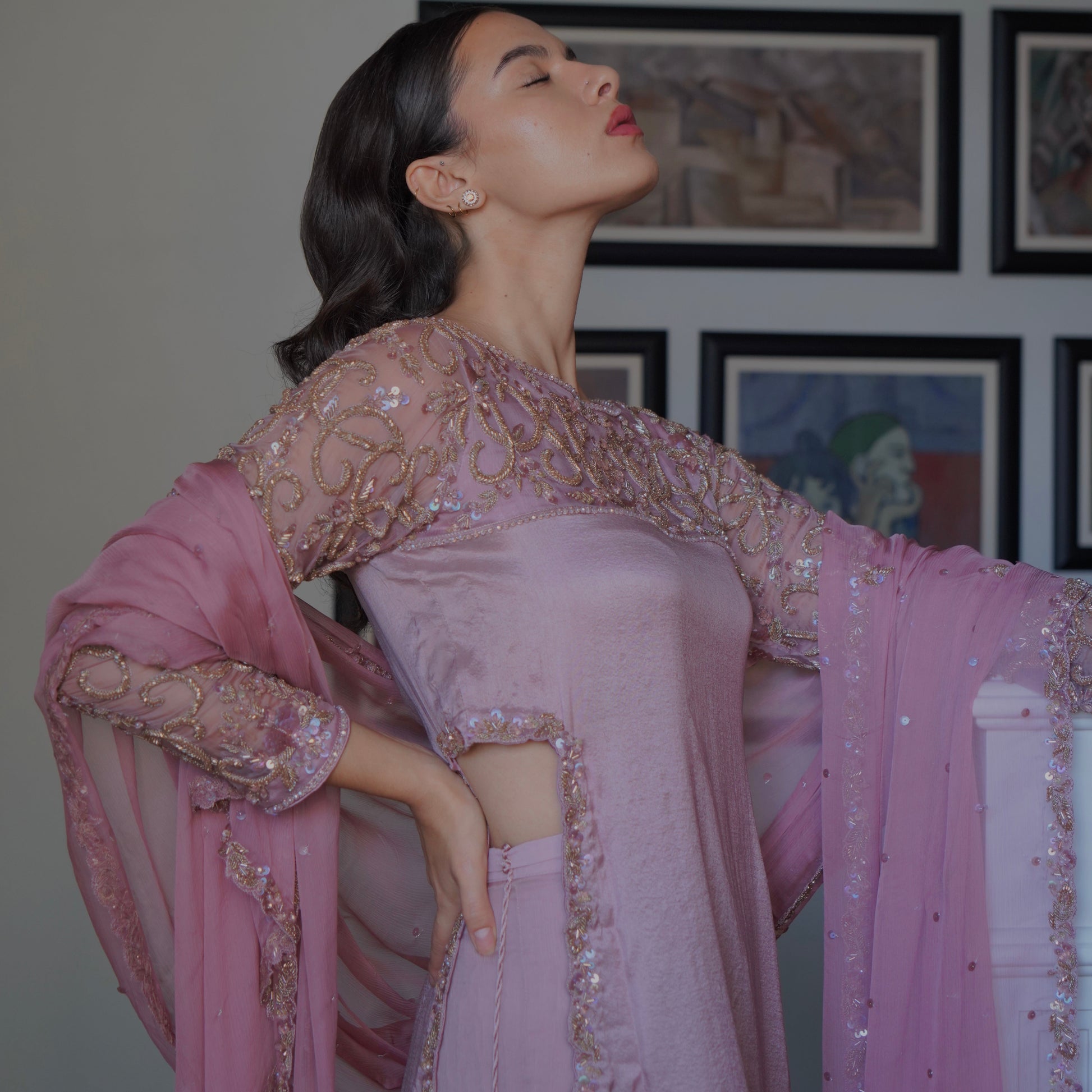 A sublime dusty pink raw silk long shirt featuring intricate floral embellishment along the high slits. The heavily embellished neck and sleeves are made from chiffon. It is paired with wide leg chiffon sharara and a chiffon dupatta bordered with beaded embroidery on all four sides and scattered sequin and motif detail.