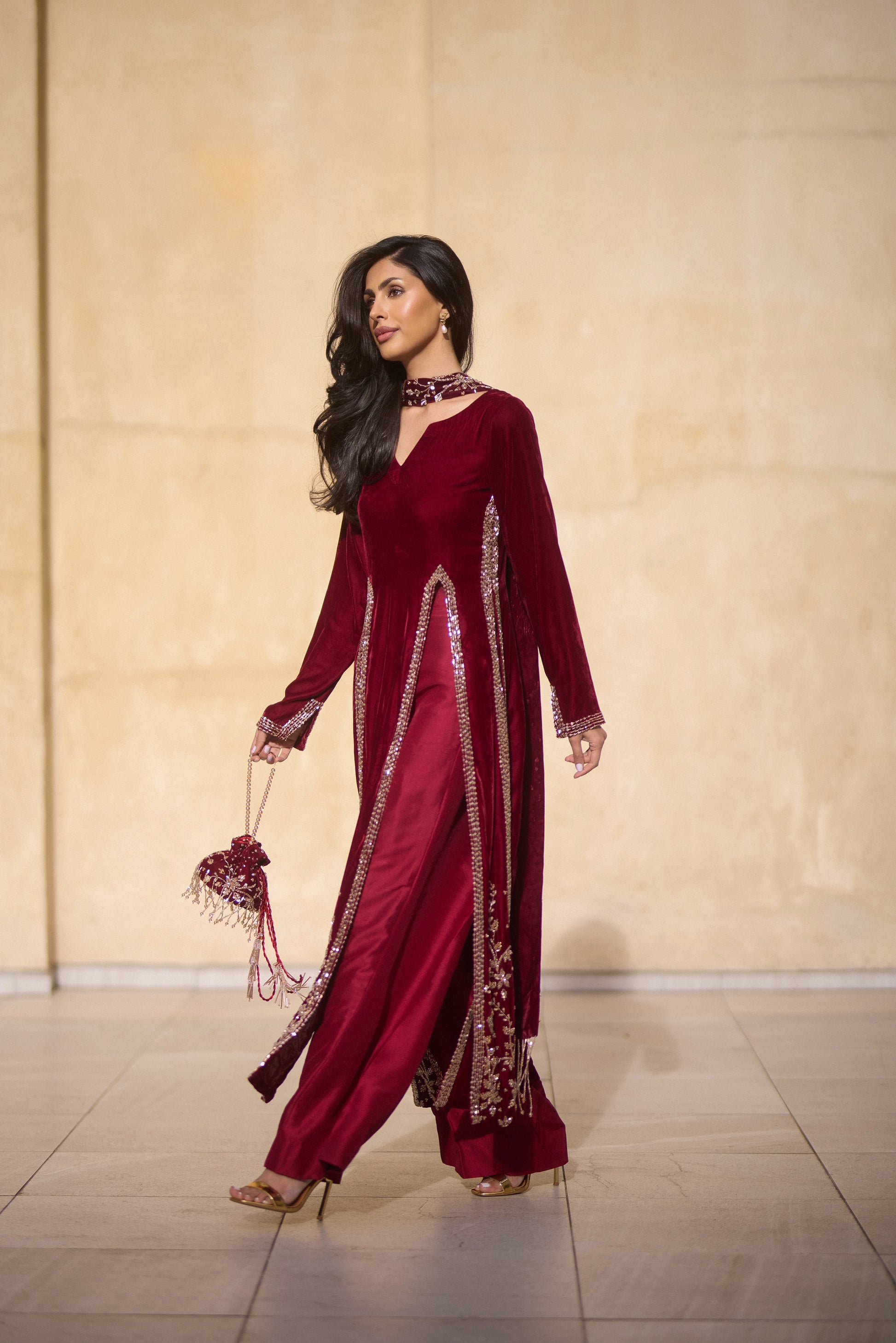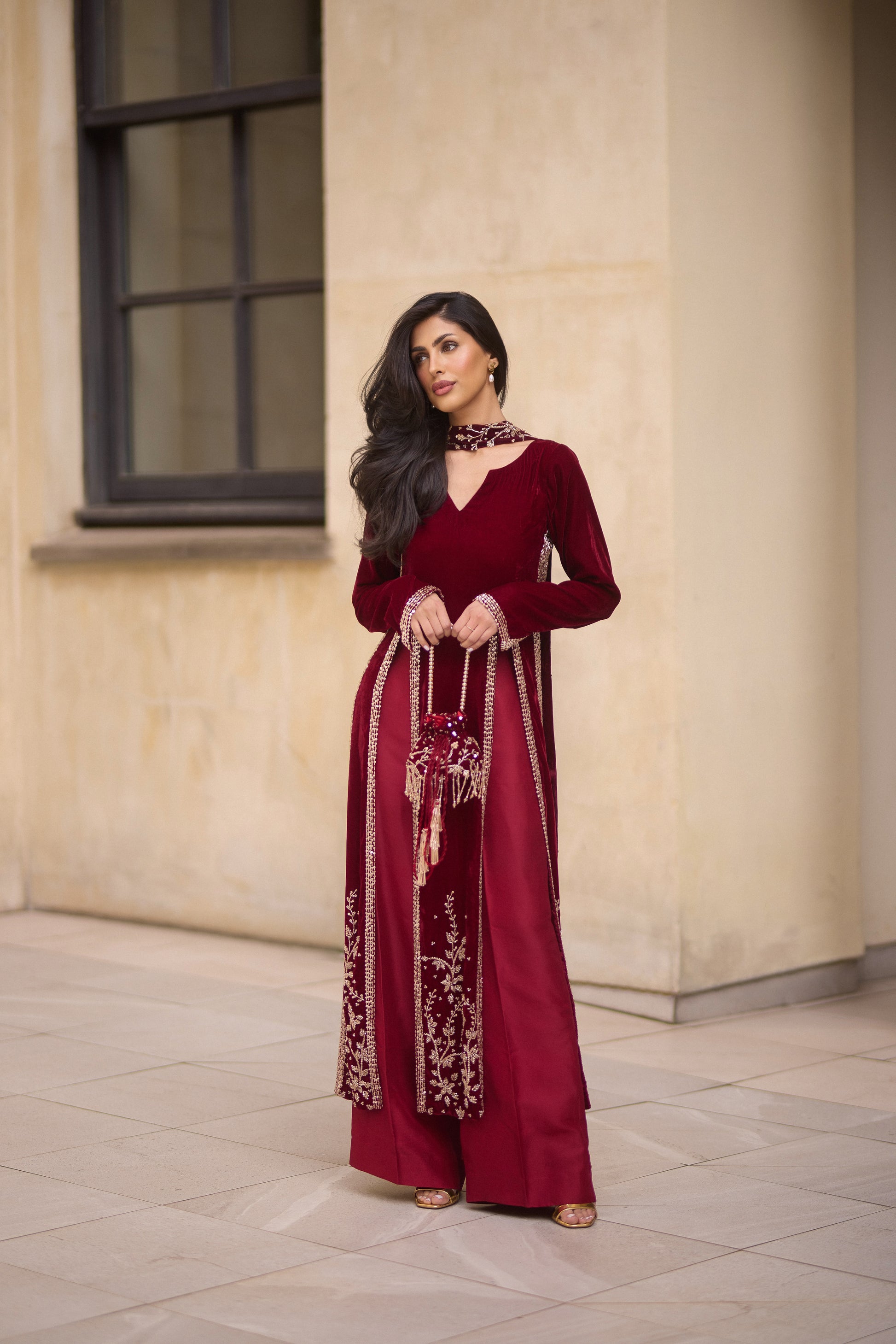 Step into elegance with this regal maroon velvet kameez set, featuring intricate floral beadwork that exudes timeless luxury. The front-slit design adds a contemporary touch, complementing the effortless grace of the matching culottes. Paired with a heavily embellished dupatta and a coordinated statement bag, this ensemble is the epitome of grandeur. Perfect for any festive occasion. This set is a masterpiece of rich craftsmanship and refined sophistication.