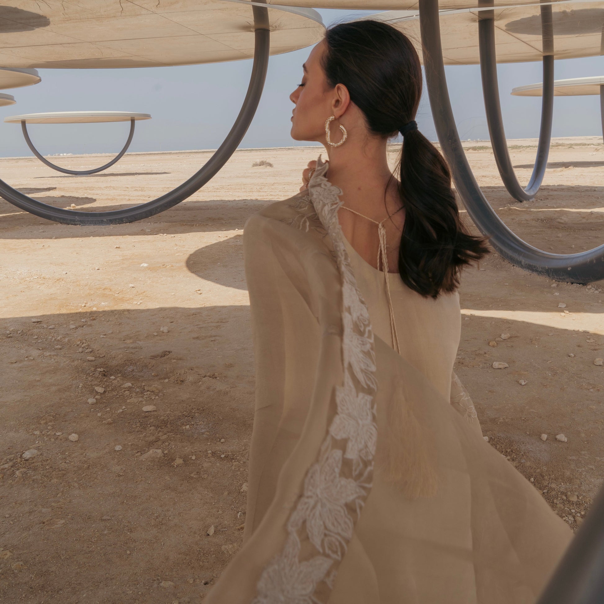 ⋄ Raw Silk 80g ⋄ Long shirt with high slits ⋄ Deep round neck with tassels ⋄ Culottes with embroidery and cutwork.