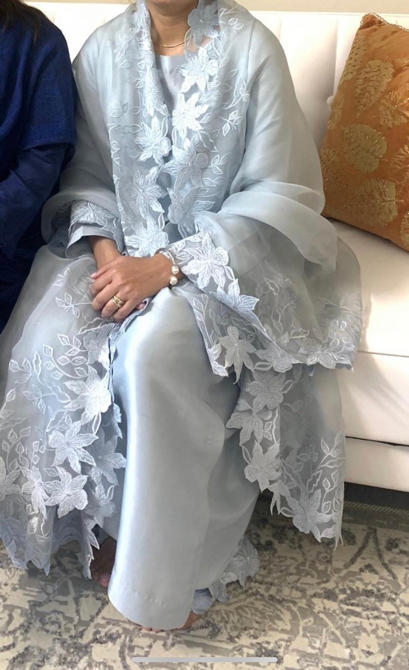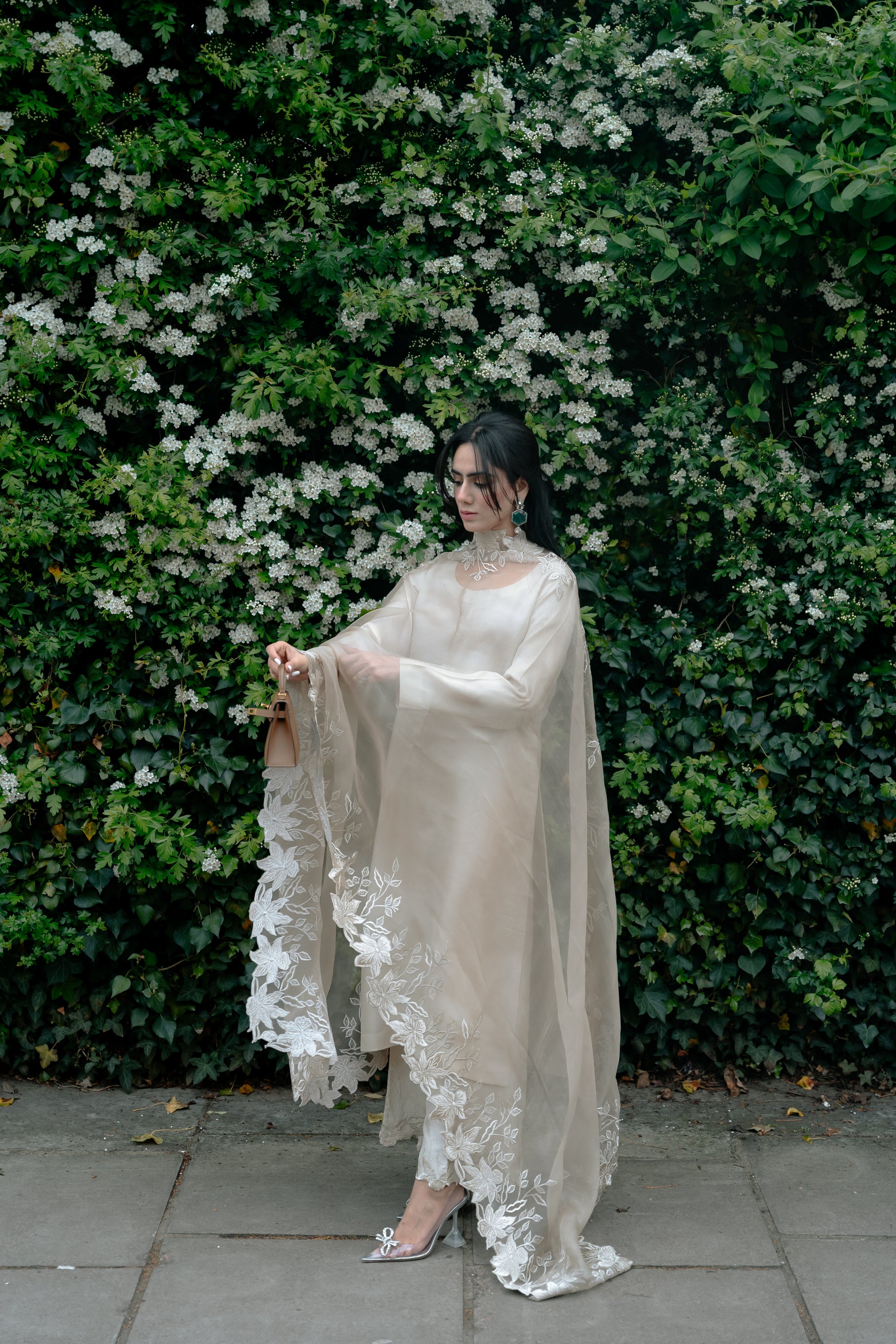 An opulent raw silk shirt with high slits and deep round neck. The back of the shirt features hanging tassels made from silk thread. It is paired with raw silk culottes with intricate floral embroidery on the borders. It also comes with an organza dupatta bordered with thread embroidery on all four sides.