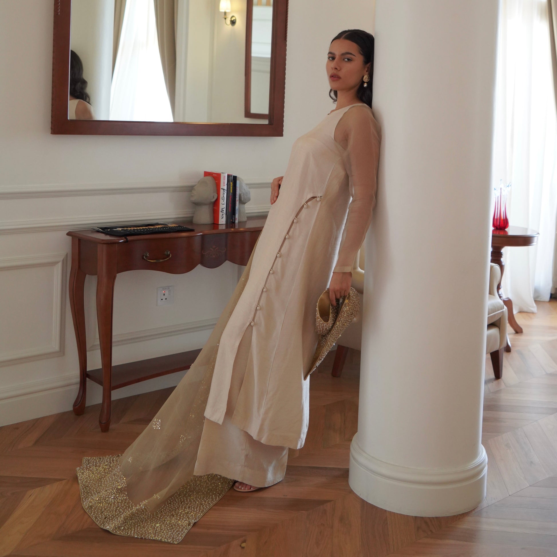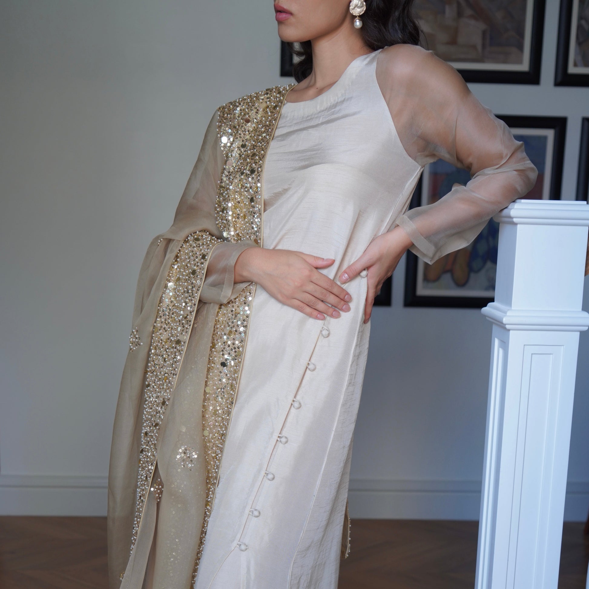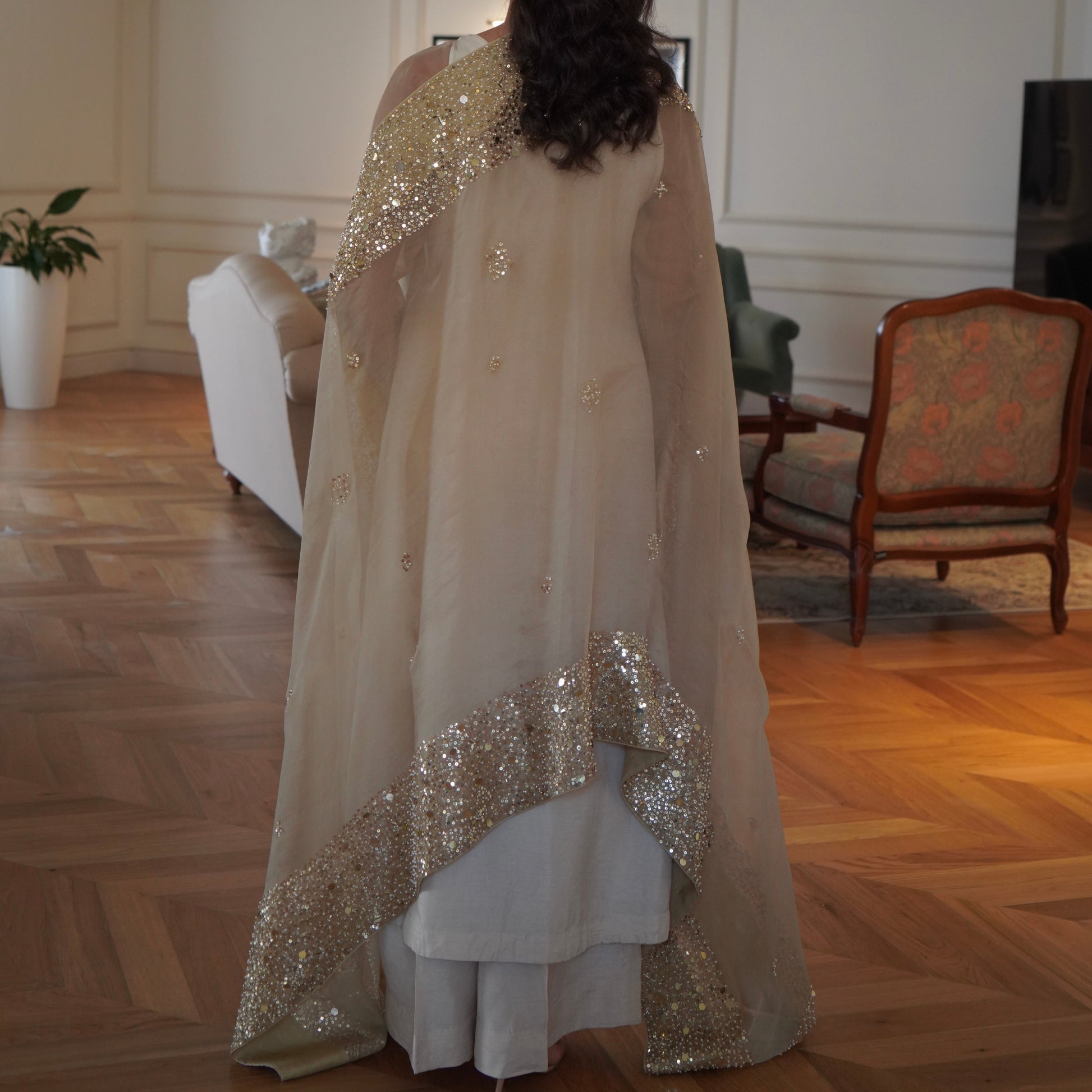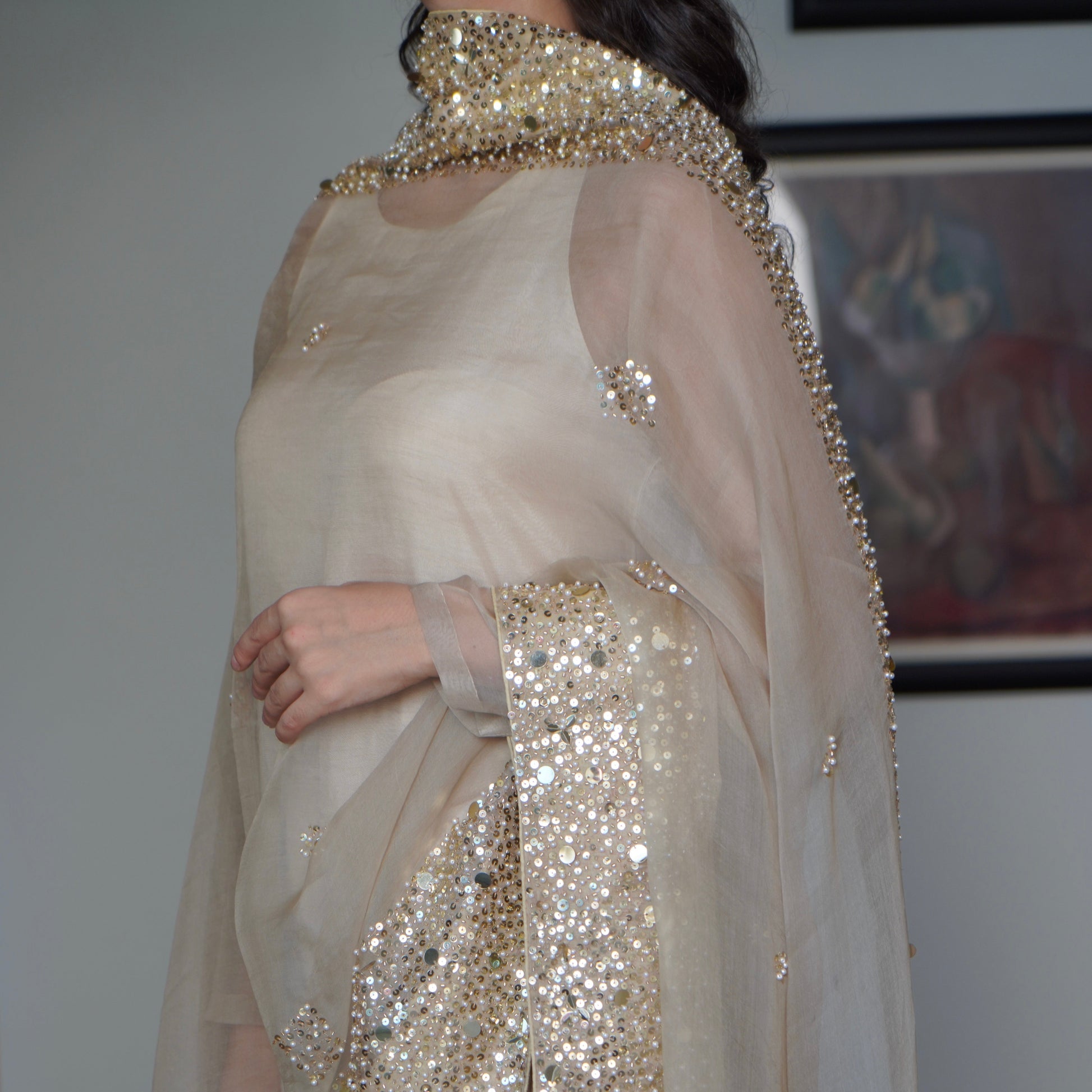 An opulent Korean silk shirt with a round neck and long sheer sleeves. The kameez features a slit at the front with button details and is paired with wide leg culottes. It also comes with an organza dupatta heavily embellished with sequins on all four sides and sequin motif in the centre.